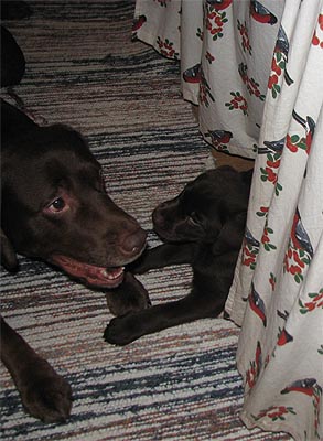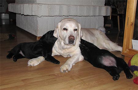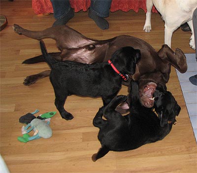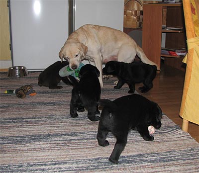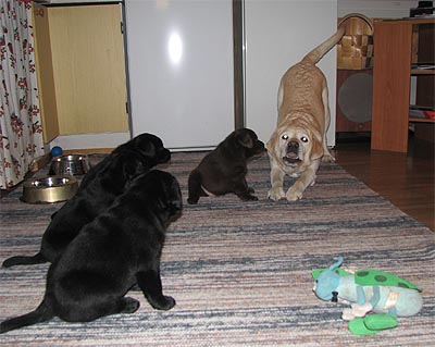 isoveli Milou, joka on aivan ihanasti alkanut leikkiä pentujen kanssa.